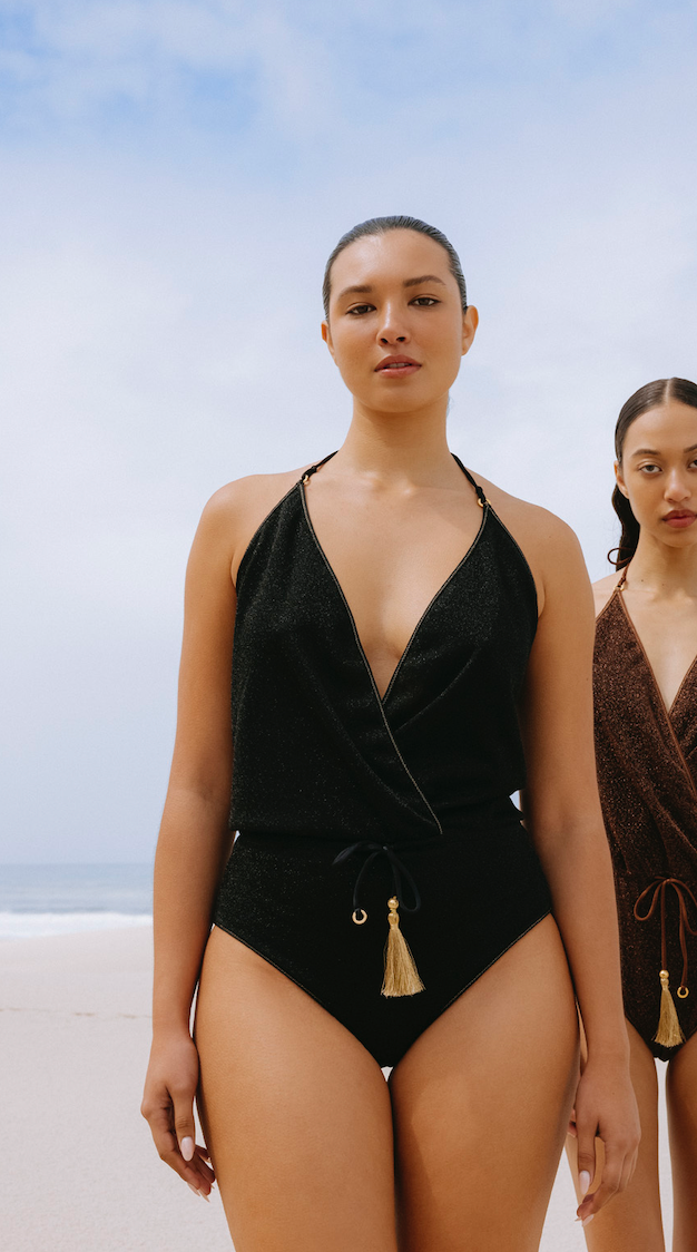 Glitter swimsuit with real gold-plated accessories and a golden stitch. Tie-neck top, fitted bottom, and adjustable waist to accentuate your shape. Stunning in the sunlight and crafted in Europe.