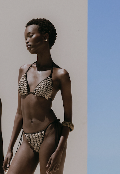 Triangle bikini with removable padding, gold pom poms embroidered in Italy, and real gold-plated accessories. Crafted in Europe.