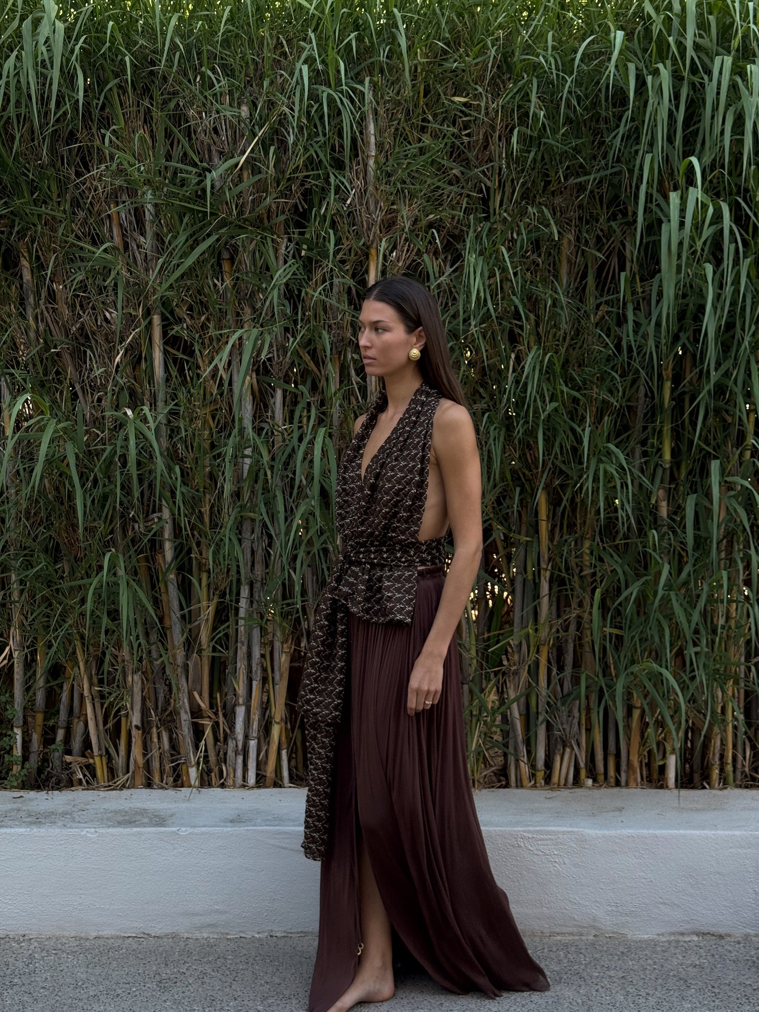 Floor-length skirt in 100% silk with real gold-plated rings. Style the flowing silhouette with our matching top or wear it as a dress using the included silk belt.