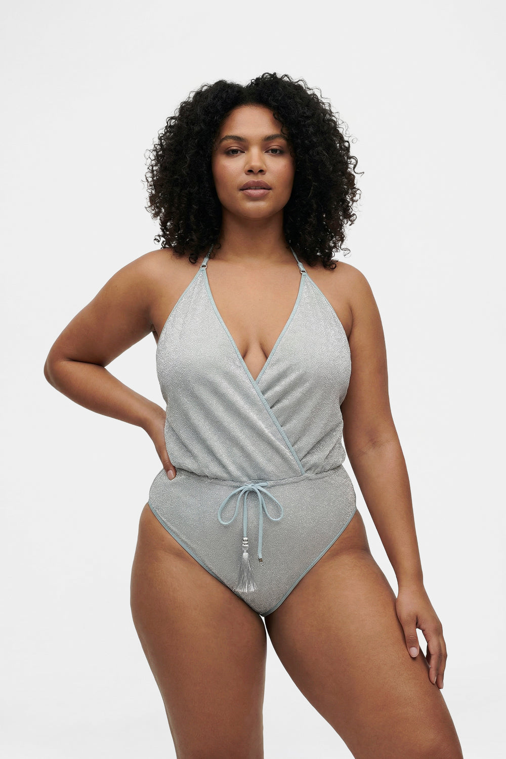 Glitter swimsuit with real gold-plated accessories and a golden stitch. Tie-neck top, fitted bottom, and adjustable waist to accentuate your shape. Stunning in the sunlight and crafted in Europe.