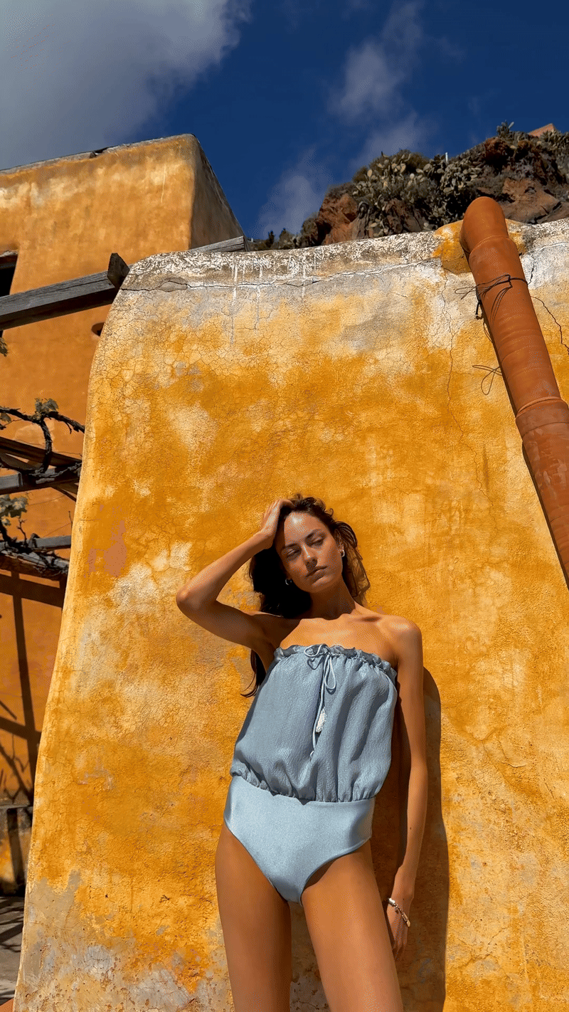 Bandeau swimsuit with a fitted bottom and 100% silk top. A bestseller for over 10 years, it’s designed for comfort and adorned with real silver-plated accessories. Wear it in the pool, the ocean, or style it as a top with a skirt.