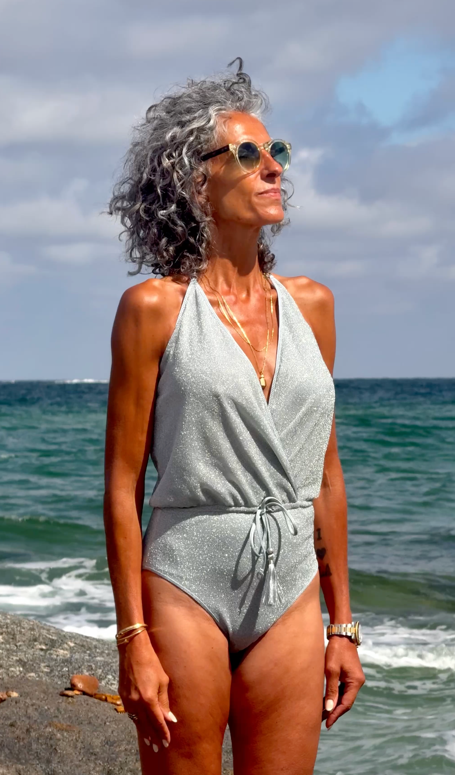 Glitter swimsuit with real silver-plated accessories and a silvery stitch. Tie-neck top, fitted bottom, and adjustable waist to accentuate your shape. Stunning in the sunlight and crafted in Europe.