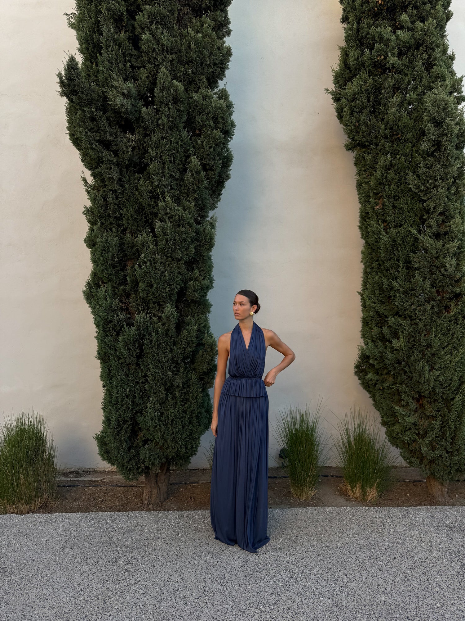 Our most popular set. Floor-length skirt and open-back top in 100% silk, finished with real silver-plated ring details. Elevate the look with our silver pins - or add the Silk Scarf for an elegant ensemble.