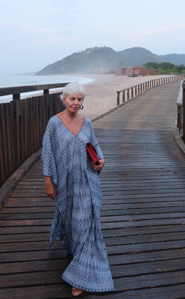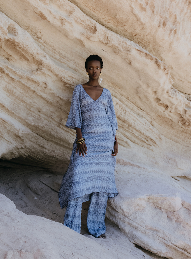 One-size kaftan in our Ocean Knit, custom-made in Italy, with silver-plated details. Designed with a deeper V-neckline and a closed front, featuring adjustable ties at the waist to shape the silhouette. Perfect over the Ocean Knit Triangle Bikini or any swimwear.