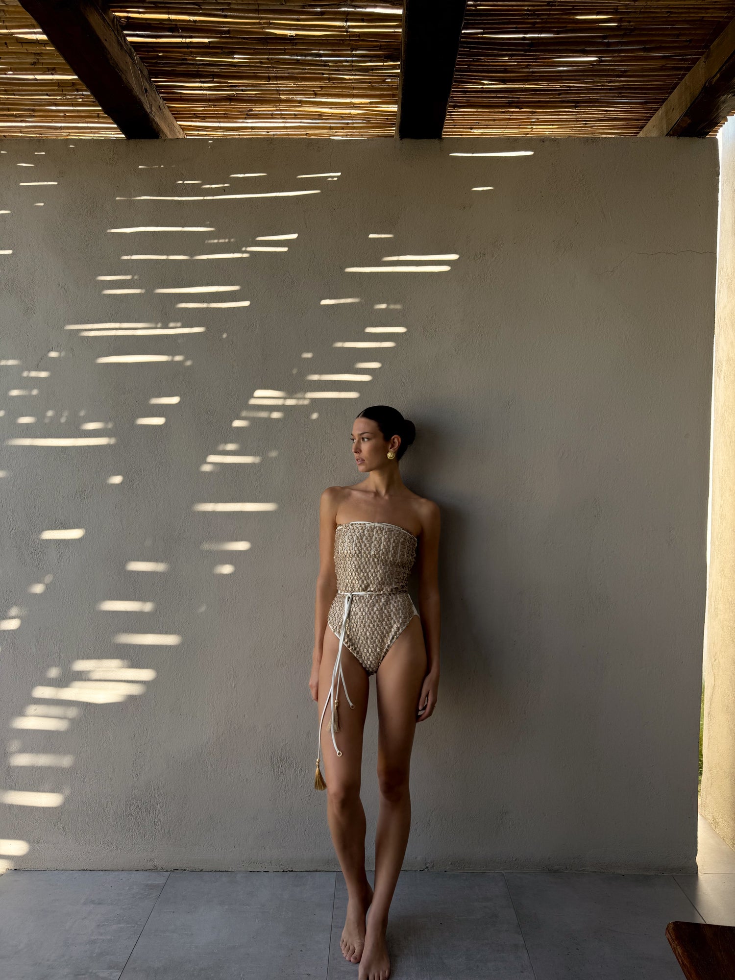 Fitted bandeau swimsuit with removable padding and a detachable belt - sculpting and flattering. Adorned with gold pom poms embroidered in Italy and real gold-plated accessories. Style with our Silk Tulle Skirt for a head-turning look. Crafted in Europe.